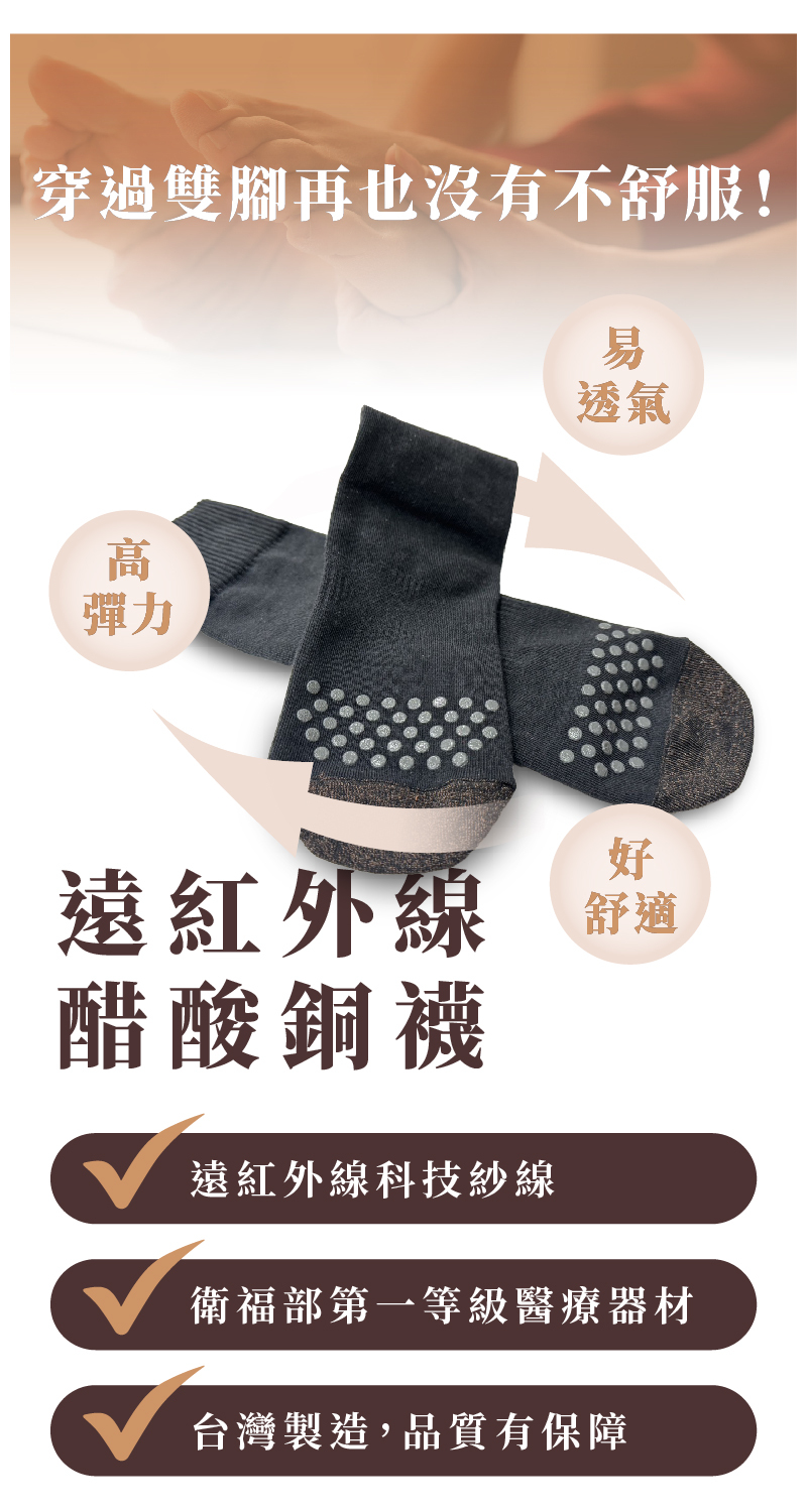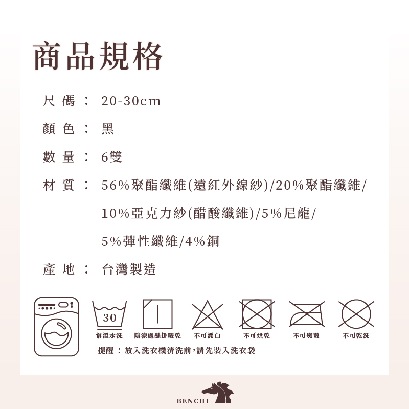 奔馳多國認證雙奈米抗癬淨脈醫療襪 6入組◆材質:成分:56%聚酯纖維(遠紅外線紗)、20%聚酯纖維、10% 亞克力紗(醋酸纖維)、5%尼龍、5%彈性纖維、4%銅◆醫療器材許可證核准品名:"民嘉"醫用輔助襪(未滅菌)◆醫療器材許可證字號:衛生福利部第一等級醫療器材許可證:衛部醫器製壹字第006569號◆醫療器材廣字號:動態:衛部器廣字第10905014號, 靜態:衛部器廣字第1090513號◆醫療器材藥商名稱:民嘉科技有限公司◆醫療器材製造廠名稱:宇駿襪業有限公司◆醫療器材製造廠地址:彰化縣員林鎮大饒里員集路二段244巷19號◆許可執照字號:桃市藥販字第MD6232027713號◆藥商名稱:上宜國際有限公司◆藥商地址:桃園市桃園區縣府路110號8樓◆製造日期:請參閱中文標示◆使用年限:無◆藥商諮詢專線:(03)4252660◆注意事項:請參閱說明◆使用方式:請參閱說明◆適穿腳長:20-30cm◆產地:台灣◆消費者使用前應詳閱產品說明書