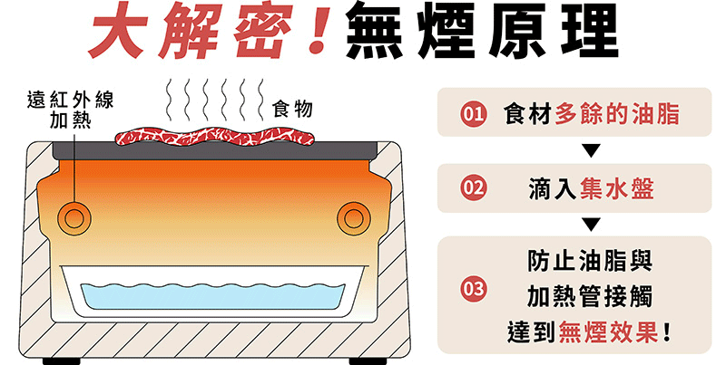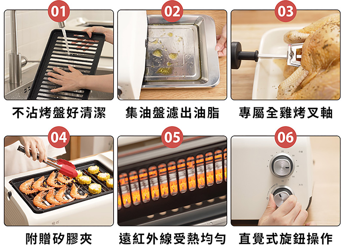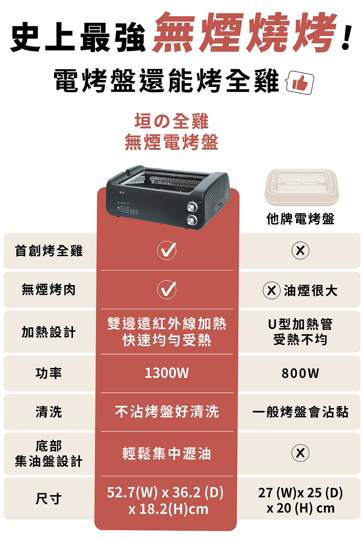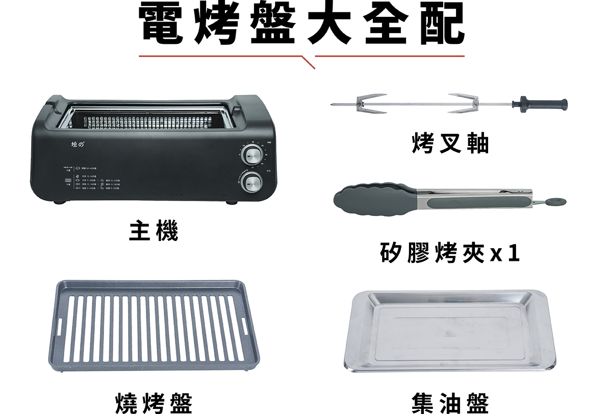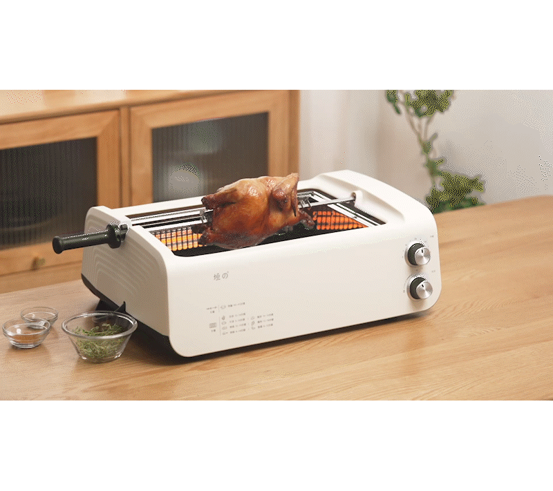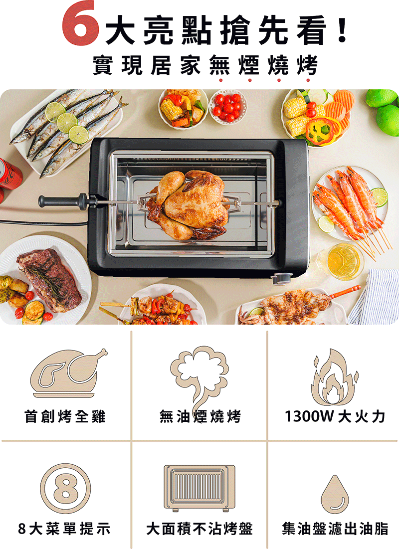 1300W超大火力,360度旋轉烤架,全雞燒烤一機滿足,獨家遠紅外線加熱技術,防油煙的集油盤設計,在家就能享受無煙燒烤!