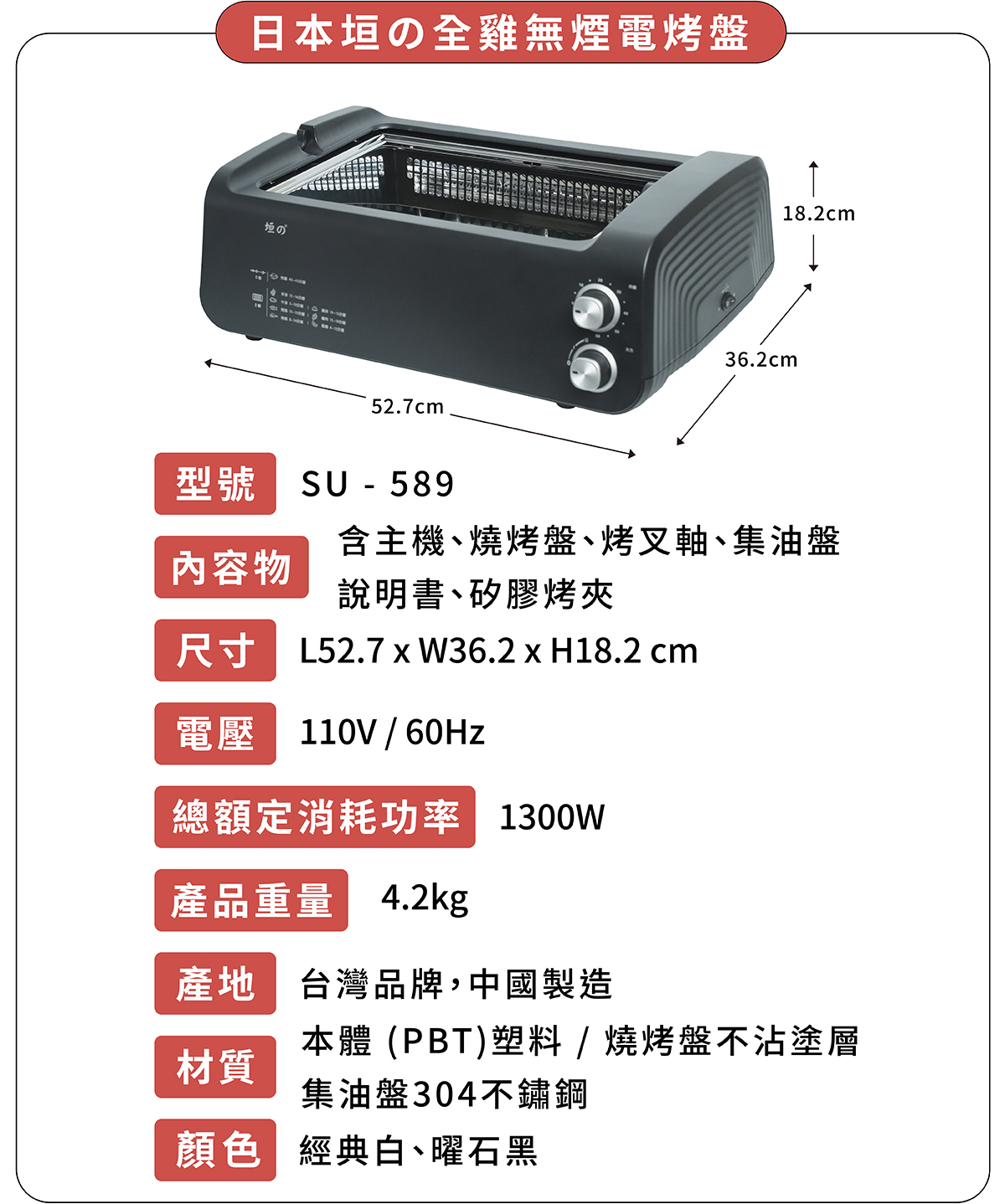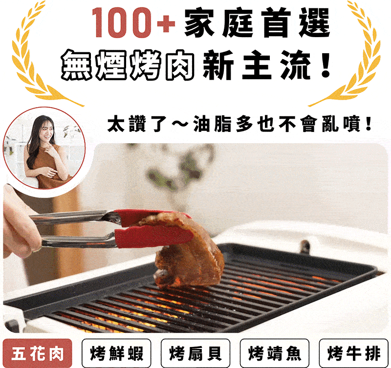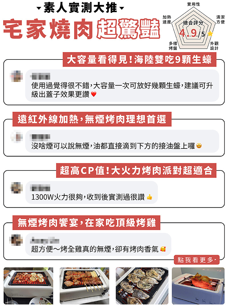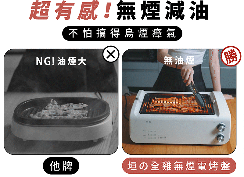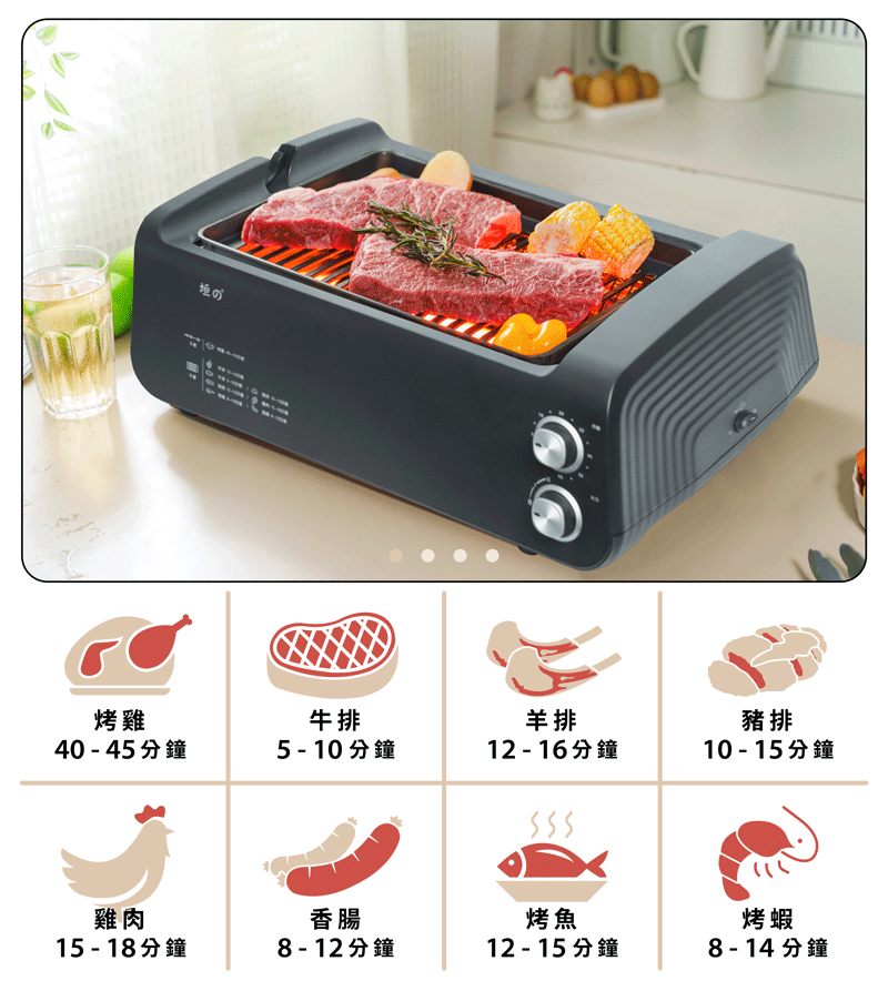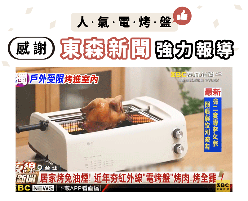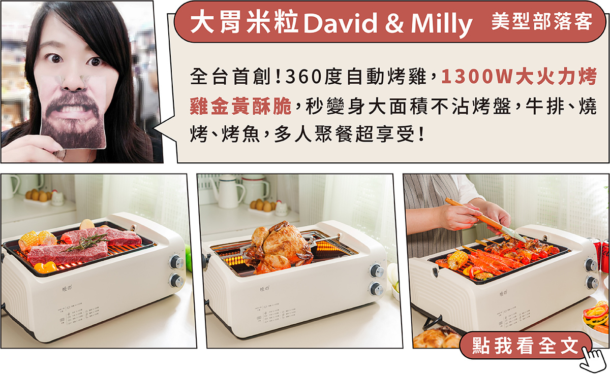 1300W超大火力,360度旋轉烤架,全雞燒烤一機滿足,獨家遠紅外線加熱技術,防油煙的集油盤設計,在家就能享受無煙燒烤!